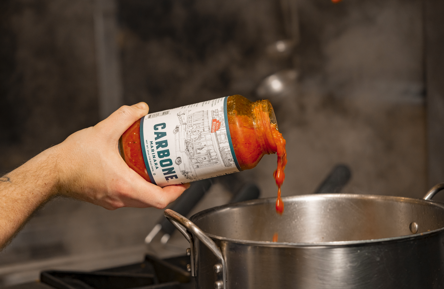 6. Add the marinara sauce and beef stock to the pot. Return the browned meat to the pot and stir.