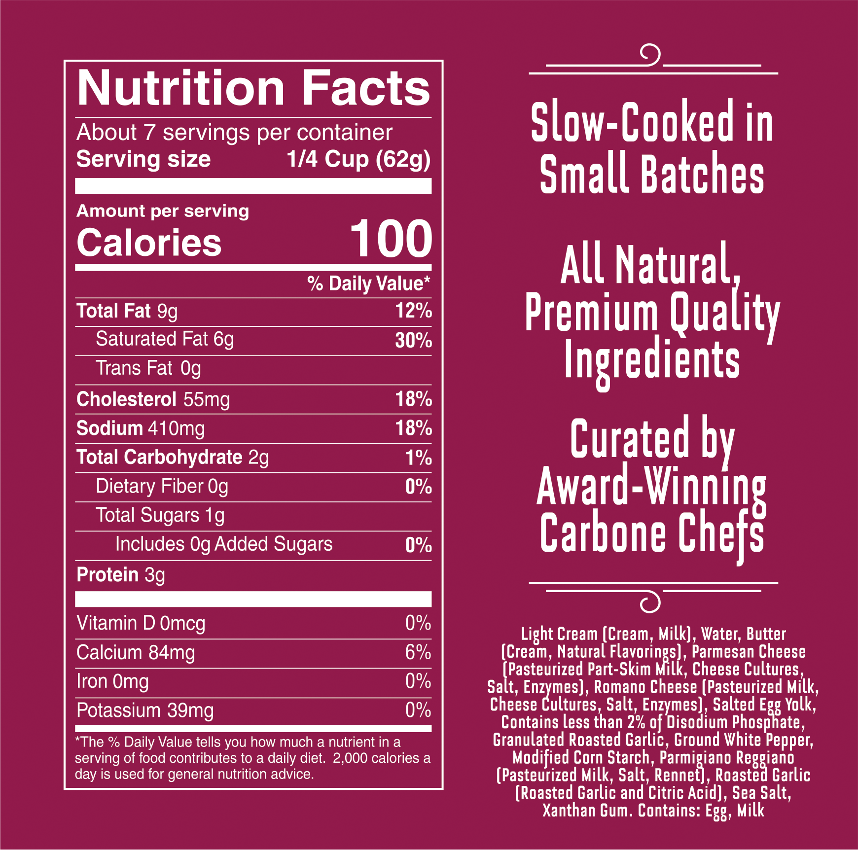 Light Cream(Cream, Milk), Water, Butter(Cream, Natural Flavorings), Parmesan Cheese(Pasturized Part-Skim Milk, Cheese Cultures, Salt, Enzymes), Romano Cheese (Pasteurized Milk, Cheese Cultures, Salt, Enzymes), Salted Egg Yolk, Contains less than 2% of Disodium Phosphate, Granulated Roasted Garlic, Ground White Pepper, Modified Corn Starch, Parmigiano Reggiano (Pasteurized Milk, Salt, Rennet), Roasted Garlic (Roasted Garlic and Citric Acid), Sea Salt, Xanthan Gum. Contains: Egg, Milk