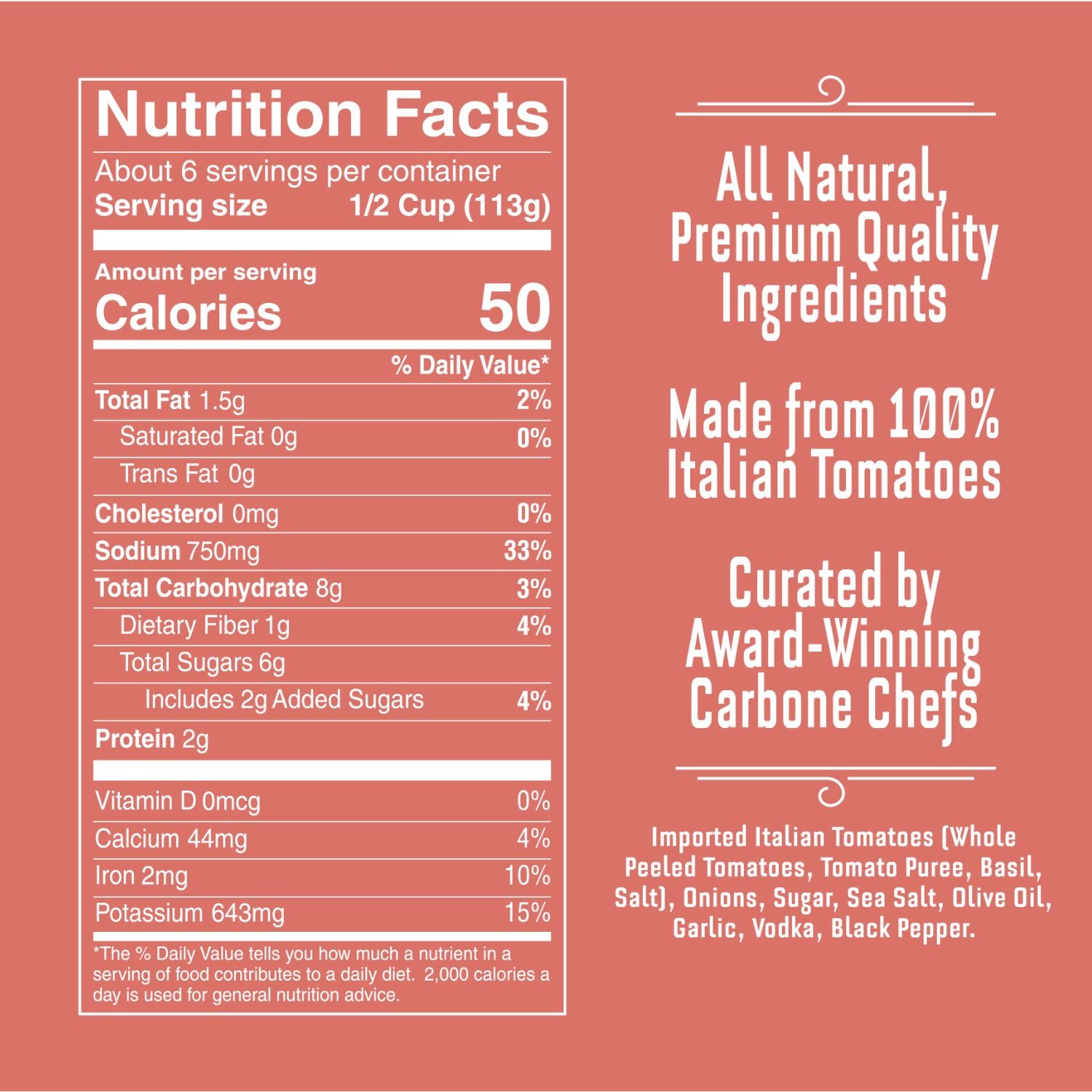 Imported Italian Tomatoes (Whole Peeled Tomatoes, Tomato Purre, Basil, Salt), Onions, Sugar, Sea Salt, Olive Oil, Garlic, Vodka, Black Pepper