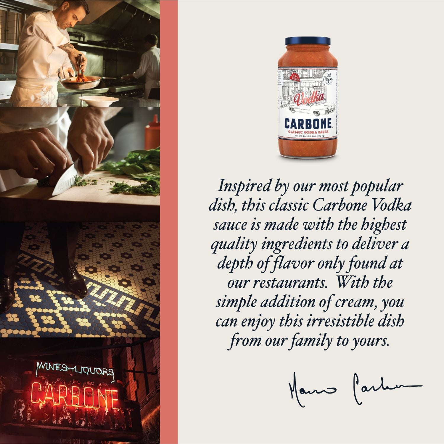 Inspired by our most popular pasta sauce flavor, this classic Carbone Vodka Sauce is made with the highest quality ingredients to deliver a depth of flavor only found at our restaurants. With the simple addition of cream, you can enjoy this irresistible dish from our family to yours.